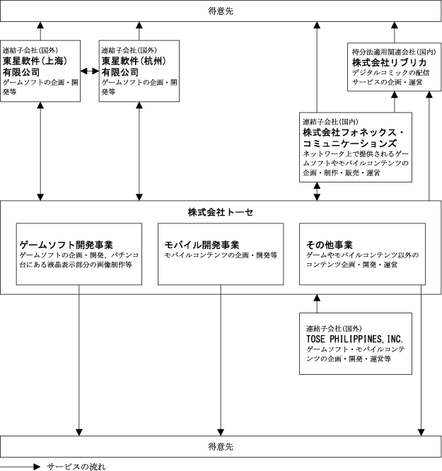 | 平成25年6月 | 営業体制の変更に伴い、現地法人「TOSE SOFTWARE USA, INC.」を解散。東南アジア市場に向けたコンテンツの配信や日本の有力コンテンツを現地向けに開発することを目的として、フィリピン共和国マニラ首都圏に現地法人「TOSE PHILIPPINES, INC.」(現 連結子会社)を設立。 |