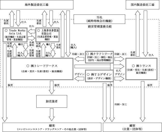 Section titled “3 【事業の内容】”当社グループは、純粋持株会社(当社)及び連結子会社6社(株式会社トランス、株式会社トレードワークス、株式会社クラフトワーク、株式会社T3デザイン、Trade Works Asia Limited、上海多来多貿易有限公司)により構成され、一般雑貨製品・エコ雑貨製品・ヘルスケア&ビューティ雑貨製品の企画・デザインから生産(委託)・生産品質管理・販売まで一貫した事業展開を行っております。当社グループは、顧客や市場の求めるカスタムメイド雑貨製品を主にエンドユーザーとなる企業向けに直接販売しており、また自社オリジナル雑貨製品を卸売業者向けに販売しております。
