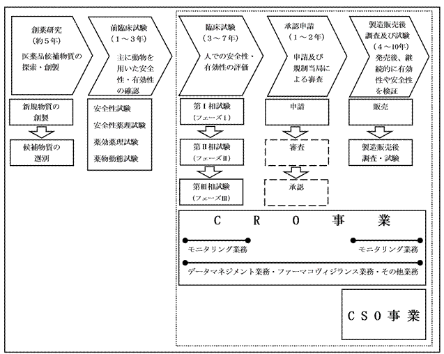 製薬会社等による医薬品開発には多額の研究開発費と長期にわたるプロセスが要求されており(「図.医薬品開発のプロセスと当社グループの事業との関わり」参照)、新薬は医薬品として承認される前段階において、製薬会社等からの委託を受けた医療機関が必ず臨床試験(治験)を実施することとなっております。臨床試験には、健康成人を対象として安全性の検討を行う第Ⅰ相試験(フェーズⅠ)、少数患者を対象として有効性・安全性を確認し用法・用量の検討を行う第Ⅱ相試験(フェーズⅡ)、多数の患者を対象として既存薬等との比較を行い新薬の有効性・安全性を検討する第Ⅲ相試験(フェーズⅢ)があり、いずれの試験においても、文書によるインフォームド・コンセント(注)3により同意した被験者の参加が必要であります。すなわち、この臨床試験は、製薬会社等、医療機関、被験者の三者により構成、実施されるものであります。