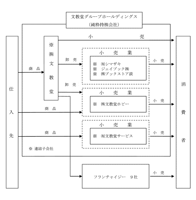 Section titled “3【事業の内容】”当社グループは、持株会社である当社「㈱文教堂グループホールディングス」および当社の関係会社によって構成されており、書籍・雑誌等の販売を主たる事業としております。