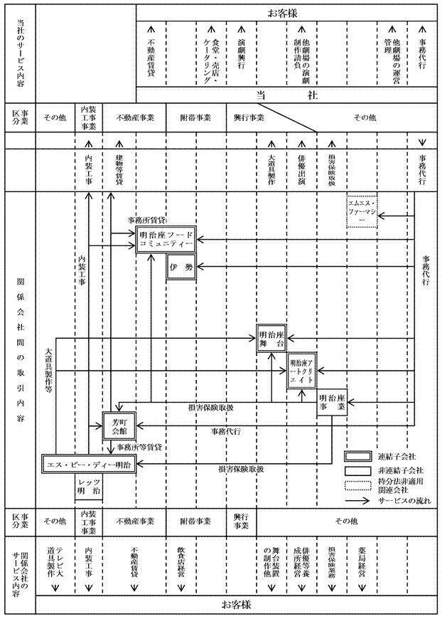 Section titled “3【事業の内容】”当社グループは当社、子会社8社及び関連会社1社で構成され、演劇興行事業、劇場内外での飲食店の経営等の附帯事業、不動産賃貸事業、内装工事事業及び演劇制作請負等その他の事業を行っております。