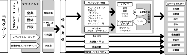 PR事業は、企業・団体・行政の情報を効果的にステークホルダーに発信し、企業・団体・行政に対して良好なイメージを醸成し、信頼感や購買行動へとつなげていく事業であり、当社グループは様々なサービス・手法や業界随一のメディア情報を有し、そのクライアントに最適な広報戦略を立案し、提供しております。