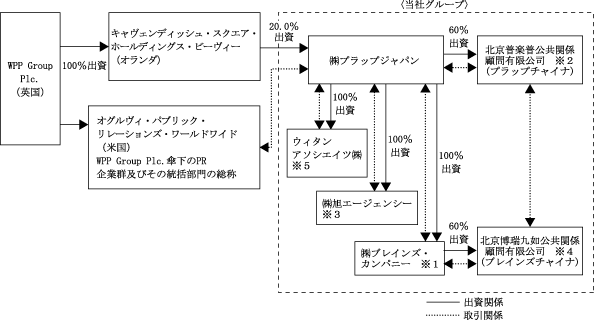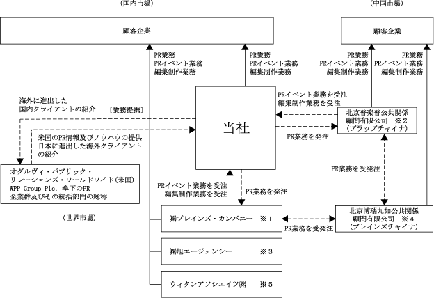 Section titled “3 【事業の内容】” 当社グループは平成25年8月31日現在、当社及び株式会社ブレインズ・カンパニー(連結子会社)、株式会社旭エージェンシー(連結子会社)、ウィタンアソシエイツ株式会社(連結子会社)、北京普楽普公共関係顧問有限公司(連結子会社)、北京博瑞九如公共関係顧問有限公司(連結子会社)により構成されており、企業の広報活動の支援・コンサルティング業務を中心としたPR事業を行っております。