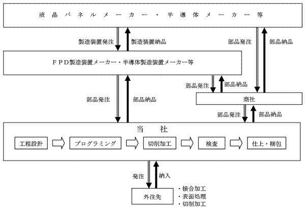 現在、当社が製造する主なFPD製造装置関連部品は、FPD製造装置に組み込まれ、製造装置メーカーを通じて液晶製造工場に納品され、また、半導体製造装置関連部品も同様に製造装置メーカーを通じて、半導体製造工場に納品されております。