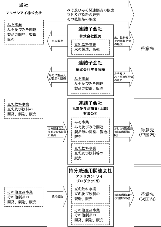 Section titled “3 【事業の内容】”当社グループは、当社(マルサンアイ株式会社)と連結子会社3社(株式会社匠美、株式会社玉井味噌、丸三愛食品商貿(上海)有限公司)及び持分法適用関連会社1社(アメリカン・ソイ・プロダクツINC.)により構成されており、みそ及び豆乳・飲料の製造販売を主な事業の内容としております。