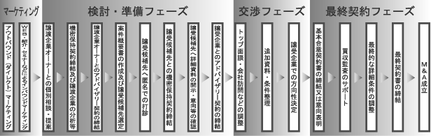 条件交渉が行われ確定した時点で「最終契約」の締結及び譲渡決済の段取りを行い、譲渡代金の決済と株式等の移転がなされた時点で当社が行う一連の役務提供は全て終了することとなります。これら業務の完了にともない双方から「アドバイザリー契約」に基づき最終的な成功報酬(受領済みの「着手金」又は「中間報酬」を除いた残金)を受領致します。