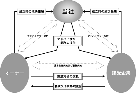 そのなかで当社は設立以来、M&A(企業の買収・合併・資本提携など)の仲介事業を主たる業務としており、これら事業の引継ぎに悩みを抱え、又は清算を考えているオーナーに対し、M&Aによる問題解決を提案し、実現していくまでをサポートすることを主たるサービスとしております。当社は譲渡企業のオーナーと譲受企業の間に立ち、アドバイザリー業務を提供しており、その対価として、それぞれより着手金又は中間報酬及び成功報酬を受領しております。