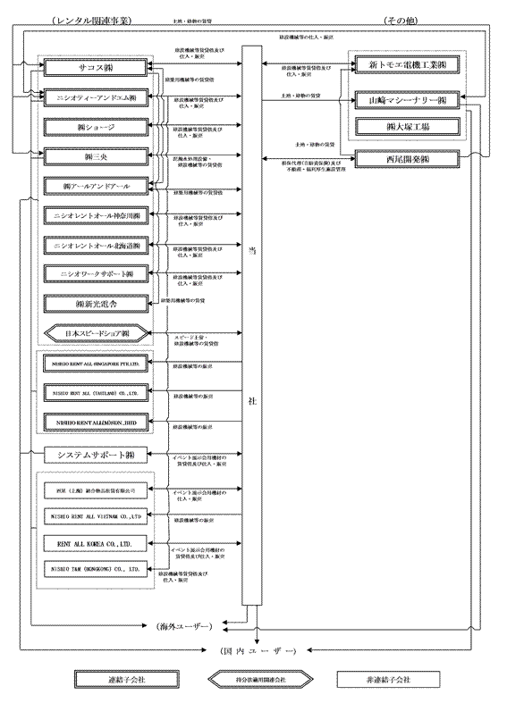 Section titled “3【事業の内容】”当社グループ(当社及び当社の関係会社)は、建設・設備工事用機器(土木・道路用機械、高所作業用機械、建築用機械、測量機器等)及びイベント・産業用関連機材の賃貸を主な事業内容とし、その他関連する事業を行っております。当社グループは、当社及び子会社21社、関連会社1社で構成されております。
