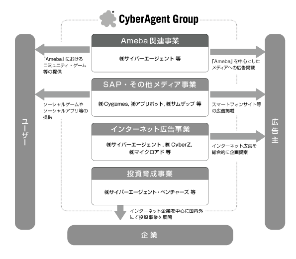 当社グループ(当社及び当社の関係会社)は平成25年9月30日現在、当社(株式会社サイバーエージェント)、連結子会社49社(うち4組合)、持分法適用非連結子会社及び関連会社5社(うち2組合)によって構成されております。