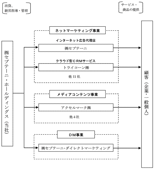Section titled “3【事業の内容】”当社の企業集団は、平成25年9月30日現在、持株会社である株式会社セプテーニ・ホールディングス(当社)及び連結子会社19社、持分法適用関連会社2社により構成されており、ネットマーケティング事業、メディアコンテンツ事業及びDM事業を展開しております。
