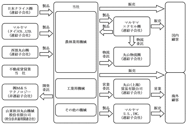 (販 売)当社が全国農業協同組合連合会、特約店などを通じて国内外に販売しているとともに、マルヤマU.S.,INC.(連結子会社)は当社が納入する製品、マルヤマ(タイ)CO.,LTD.は自社で製造する製品の一部、山東秋田丸山機械股份有限公司は自社で製造する製品を、それぞれ特約店を通じて販売しております。