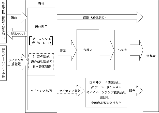 Section titled “3 【事業の内容】”当社はゲームソフトの企画、制作、開発及び販売を主たる業務としており、製品部門及びライセンス部門の二部門によって事業活動を展開しております。