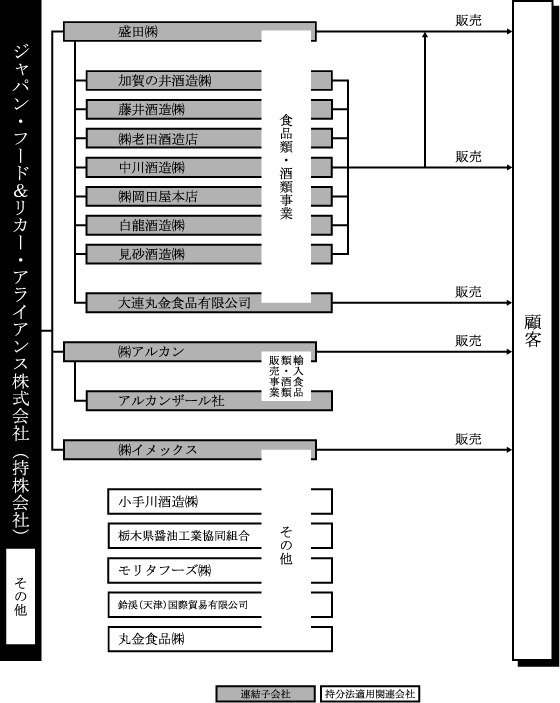 | 平成18年8月 | ジャパン・フード&リカー・アライアンス食品販売㈱がマルキン忠勇㈱、㈱ハイピース、盛田㈱から食品営業部門を分割・承継し、輸入営業部門を㈱アルカンに分割、また、酒類営業部門をジャパン・フード&リカー・アライアンス酒類販売㈱に分割 |