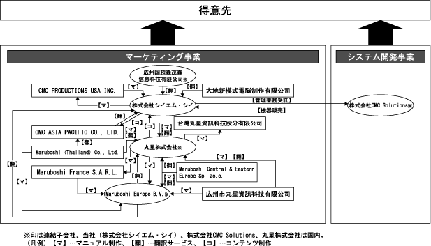 Section titled “3 【事業の内容】”当社グループは、当社、連結子会社(株式会社CMC Solutions、丸星株式会社、Maruboshi Europe B.V.、広州国超森茂森信息科技有限公司)、非連結子会社かつ持分法非適用子会社(CMC PRODUCTIONS USA INC.、大地新模式電脳制作有限公司、CMC ASIA PACIFIC CO., LTD.、Maruboshi France S.A.R.L.、Maruboshi Central & Eastern Europe Sp. zo.o. 、広州市丸星資訊科技有限公司、Maruboshi (Thailand) Co., Ltd.、台灣丸星資訊科技股分有限公司)で構成されており、マーケティング事業及びシステム開発事業を行っております。