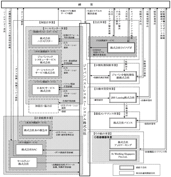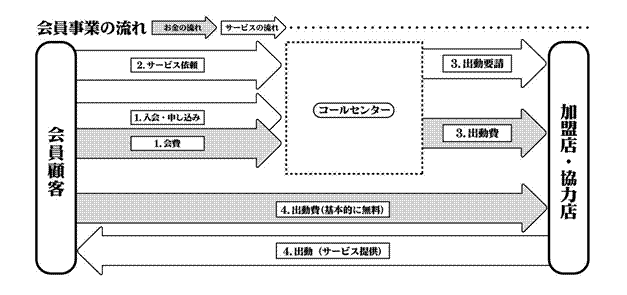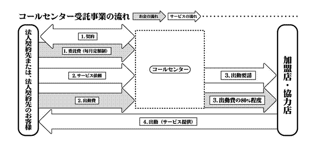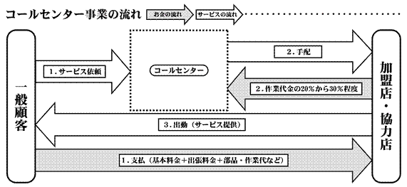 当社グループは、全国の加盟店・協力店ネットワークを使って事業を展開しております。当社グループの加盟店・協力店は、それぞれの担当地域において、当社グループが作業依頼された各種の生活トラブル解決サービスを実際にお客様に提供します。当社グループは、自社のコールセンターにおいて、多数のお客様のお問合せを迅速に処理し、お客様の最寄りの加盟店・協力店に作業手配を行います。お客様のもとに駆けつけたサービススタッフが作業を完了するまで、お客様とサービススタッフをフォローいたします。また、お客様に満足いただけるサービスを提供し、「生活救急グループ」ブランドを発展させるために、加盟店・協力店スタッフのサービス内容のチェックや指導を行い、加盟店・協力店ネットワークを強化するために加盟店・協力店の新規募集、教育、育成等総括的管理を行っております。