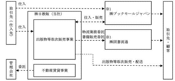 Section titled “3【事業の内容】”当社グループ(当社及び当社の関係会社)は、当社(株式会社日教販)、子会社2社で構成され、各種教科書、書籍、雑誌、教材、教育用機器、情報機器及びこれら機器のソフトウェア等の取次販売と、これらに関連する配送業務ほか不動産の賃貸等の事業を営んでおります。