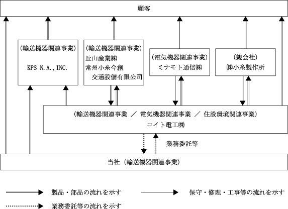 当部門の主要製品は、道路照明、スポーツ施設照明、道路情報装置、交通信号保安機器及び工事等であります。コイト電工株式会社が製造しており、シールドビーム、回転灯等の一部を親会社の株式会社小糸製作所より仕入れております。また、交通信号保安関係等の納入機器の保守・修理・工事の一部を子会社のミナモト通信株式会社に委託しております。