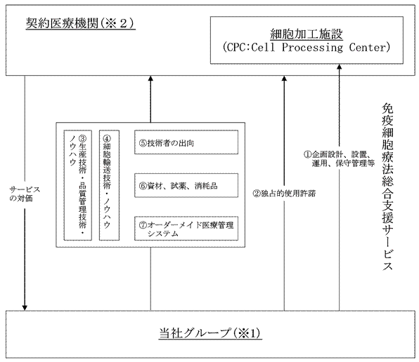 当社は、免疫細胞治療を安全かつ効率的に実施可能とする技術・ノウハウ、施設、資材、専門技術者、システム等を医療機関に対して包括的に提供する免疫細胞療法総合支援サービスを事業の中核としております。
