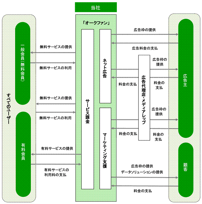 当社は、「オークファン」を利用しているすべてのユーザー、また「オークファン」ユーザー向けにサービスを告知する法人(広告主及び顧客)から、以下のような構成で収入として売上高に計上しております。