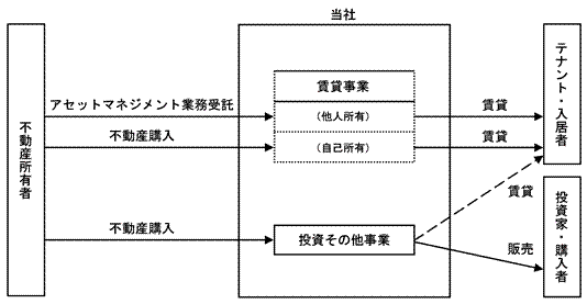Section titled “3【事業の内容】”当社は、「美しく安全で長期にわたり社会を支える街づくり」を事業運営の理念に、「都市にヨーロッパの光と風」をデザインコンセプトに据えて、不動産に係る開発、売買、賃貸、建設、設計・施工監理、及びこれらに関する調査・企画並びにコンサルティングを主たる業務として、以下のとおり、賃貸事業及び投資その他事業を展開しております。
