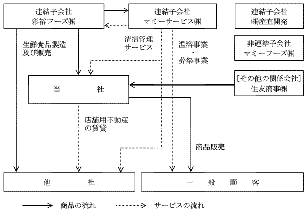主要な商品は生鮮食料品、一般食料品、日用雑貨他であり、当社が販売を行っております。また、生鮮食料品の一部は、子会社彩裕フーズ㈱が加工しており、当社店舗の清掃・管理サービスを子会社マミーサービス㈱が行っております。なお、㈱産直開発は連結の範囲に含めておりますが、事業の開始には至っておりません。