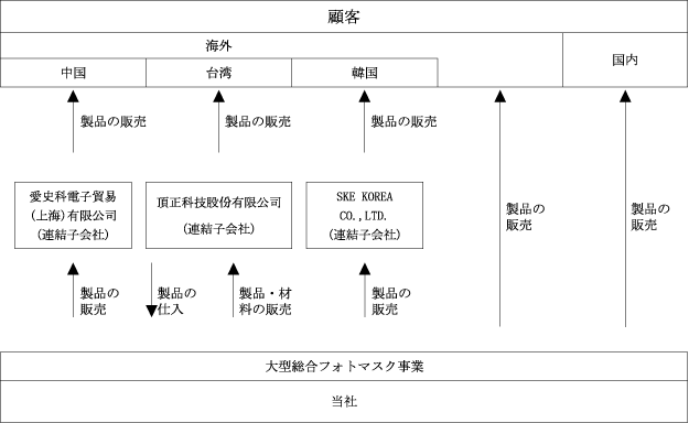 Section titled “3 【事業の内容】”当社グループは、当社のほか、連結子会社である「頂正科技股份有限公司」(本社:台湾台南科學工業園區)、「SKE KOREA CO., LTD.」(本社:韓国忠淸南道天安市)及び「愛史科電子貿易(上海)有限公司」(本社:中国上海市長寧区)の3社により構成されており、大型フォトマスクの設計・製造・販売を主な事業内容としております。当社グループの事業内容は次のとおりであります。