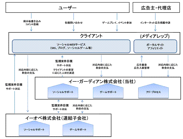 Section titled “3【事業の内容】”当社グループは、当社及び連結子会社1社(イーオペ株式会社)により構成されており、ソーシャルWEBサービス(※)を運営するクライアントに対し、当該ソーシャルWEBサービスに投稿されるコメント等への監視サービスを提供する掲示板投稿監視事業を展開しております。