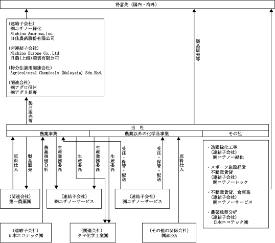 当社が製造し、全国に跨る特約店網、JA、全農及び農薬製剤メーカー等を通じて販売しています。連結子会社のNichino America,Inc.、関連会社の第一農薬㈱、持分法適用関連会社のAgricultural Chemicals (Malaysia) Sdn.Bhd.は、それぞれ米国、沖縄、マレーシアで製造、販売をしています。連結子会社の日佳農葯股份有限公司、非連結子会社のNichino Europe Co.,Ltd.は、それぞれ台湾、欧州で販売しています。また、関連会社の㈱アグロ信州、㈱アグリ長野は、当社品の販売先です。連結子会社の㈱ニチノー緑化は、ゴルフ場向け農薬及び家庭園芸用薬剤を販売しています。連結子会社の㈱ニチノーサービスに農薬の生産業務を委託しています。