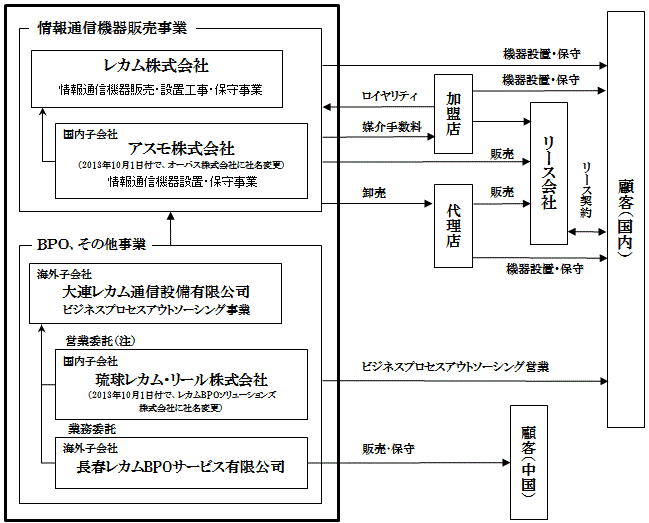 | 平成24年6月 平成24年7月 平成24年8月 平成25年6月 平成25年7月 平成25年9月〃 〃 | 中国吉林省長春市に大連レカム通信設備有限公司の子会社として長春レカムBPOサービス有限公司を設立 大連レカム通信設備有限公司が京セラドキュメントソリューションズジャパン株式会社との間でBPO事業に関する業務委託契約を締結 レカム株式会社が東京中小企業経友会事業協同組合と業務提携を開始 当社を存続会社、旧レカム株式会社を消滅会社とする吸収合併を行い、純粋持株会社体制から事業持株会社体制に再移行し、商号をレカムホールディングス株式会社からレカム株式会社へ変更東京証券取引所と大阪証券取引所の現物市場の統合に伴い、東京証券取引所JASDAQ(スタンダード)に株式を上場 株式会社アスモの情報通信機器製造事業を株式会社三洋化成製作所に事業譲渡カウネットの販売代理店事業を株式会社アルファライズに譲渡ライツ・オファリング(ノンコミットメント型/上場型新株予約権の無償割当て)を実施し、資本金を3億5,662万円に増資 |