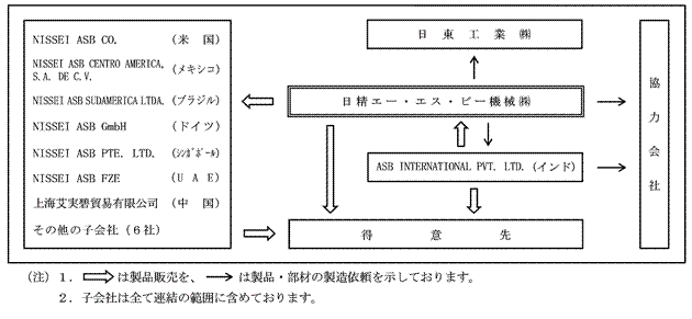 Section titled “3【事業の内容】”当社グループは、日精エー・エス・ビー機械㈱(当社)及び子会社15社により構成されており、主要な事業内容はPET(ペット)ボトルをはじめ各種プラスチック容器を製造するストレッチブロー成形機とその専用金型、付属機器及び部品の製造販売であり、かつ、これに付帯する事業を営んでおります。