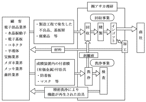 当事業は、プリント基板メーカー、コネクターメーカー等の電子部品メーカーをはじめ、宝飾品メーカー、眼鏡メーカー、歯科医院及び歯科技工所等有価金属を含有する材料を扱う業者より集荷した基板屑、不良品、廃棄品等いわゆる都市鉱山から金、銀、白金、パラジウム等の貴金属を当社独自の技術にて分離・回収し、返却又は販売する事業であります。回収した貴金属は当社が開発した「ハイエクト装置」による溶媒抽出法により精製し、当社の刻印を打刻し、主に国内の商社に販売するとともに、材料加工したものを電子材料メーカー等に販売しております。