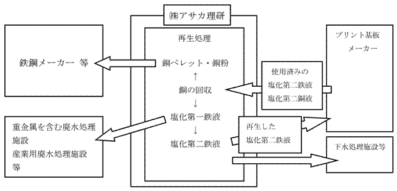 当事業は、プリント配線基板メーカーより使用済み塩化第二鉄廃液を引き取り、新液として再生し、副産物である銅を回収・販売する事業であります。プリント配線基板メーカーでは、銅を溶解し、電気回路を形成するエッチング工程で塩化第二鉄液を使用しますが、エッチング処理を行うことにより塩化第二鉄液の銅濃度が上がり、新液との入れ替えが必要となります。そのとき排出される使用済みの塩化第二鉄廃液を集荷し、これを原料として塩化第二鉄液を再生販売しております。この再生工程において塩化第二鉄液から副産物として回収される銅粉を、銅ペレット等利用しやすい形状に加工して、鉄鋼メーカー等に販売しております。
