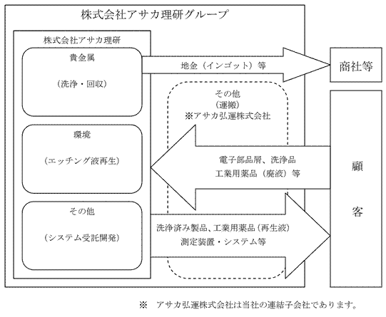 Section titled “3【事業の内容】”当社グループは、株式会社アサカ理研(当社)と子会社アサカ弘運株式会社により構成されております。当社グループの主たる事業は、電子部品屑等から貴金属を回収する貴金属事業と、エッチング廃液を再生し、銅を回収する環境事業であります。子会社のアサカ弘運株式会社は、主に貴金属事業及び環境事業の運搬業務を行っております。