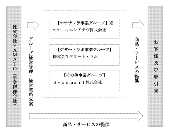 Section titled “3【事業の内容】”当社グループは、当連結会計年度において、Syoumail株式会社及び株式会社デザート・ラボの2社を新たに設立し、電子証明書付きメール「Syoumail」の販売事業及びセルフサービス型ソフトクリームショップの店舗運営及びFC事業に進出いたしました。これに伴い、当社グループは、事業持株会社である当社(㈱YAMATO)及び連結子会社3社にて構成されております。