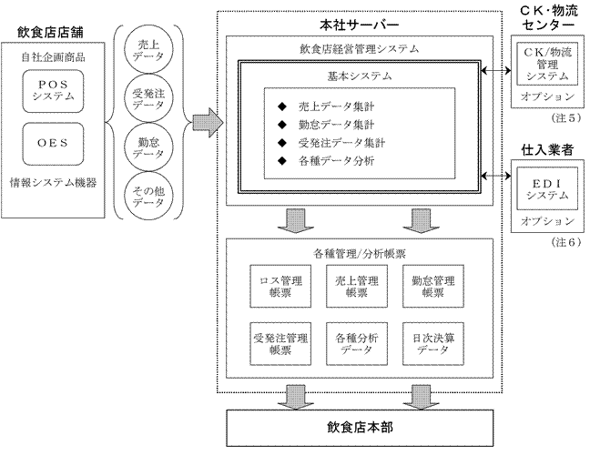 外食業界では、各店舗単位に食材から料理を作るという製造業の側面を持っているのにもかかわらず、その個別製造原価、ロス分析手法の管理体系が確立されていませんでした。当社は外食企業に対し、食材原価ロス、人件費の無駄等「ヒト・モノ・カネ」といった経営コストのロスを徹底追及する「飲食店経営管理システム」(注4)を核とした各種システムの提供を行っております。