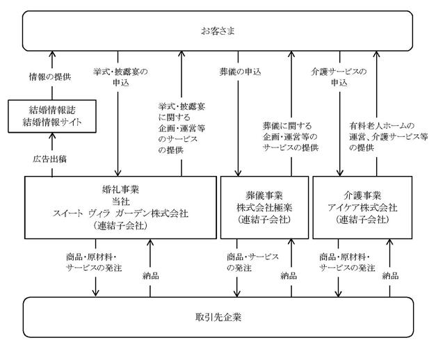 Section titled “3【事業の内容】”当社グループ(当社及び当社の関係会社)は、当社(アイ・ケイ・ケイ株式会社)及び連結子会社3社により構成されており、婚礼事業、葬儀事業、介護事業を営んでおります。