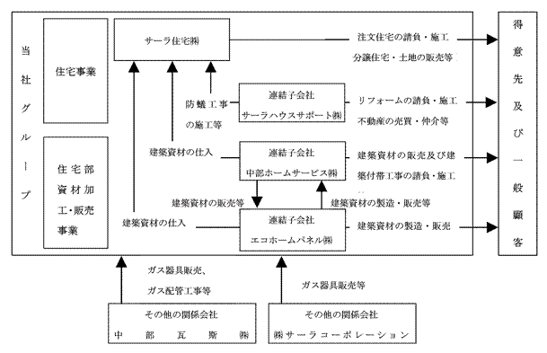 Section titled “3【事業の内容】”当社グループは、当社(サーラ住宅㈱)及び子会社3社により構成されており、住宅関連分野を中心に事業活動を営んでおります。その主な事業内容及び当社と子会社の当該事業にかかわる位置付けは次のとおりであります。また、当社は中部瓦斯㈱及び㈱サーラコーポレーションの関連会社となっております。