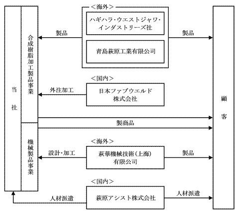 当社及びハギハラ・ウエストジャワ・インダストリーズ社にて合成樹脂加工製品関連の原糸、クロス、ラミクロスこれらの二次製品の各種製造・販売、青島萩原工業有限公司ではラミクロス製品の製造・販売を行っております。また、日本ファブウエルド株式会社ではラミクロスの二次加工を行っております。萩原アシスト株式会社は人材派遣業を生業とし、継続雇用制度の運用を図ることを目的の一部として行っております。