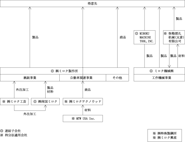Section titled “3 【事業の内容】”当社グループは当社及び子会社[㈱ミロク製作所、㈱南国ミロク、ミロク機械㈱、MIROKU MACHINE TOOL,INC.、弥勒深孔机械(太倉)有限公司]と関連会社[㈱ミロク工芸、㈱ミロクテクノウッド、㈱特殊製鋼所、㈱ミロク興産、MTW USA Inc.]で構成され猟銃事業、工作機械事業、自動車関連事業及びその他における製造・仕入及び販売を主な内容とし、事業活動を展開しております。