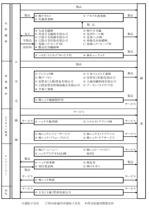 大成毛織㈱、㈱中日毛織、青島日毛織物有限公司は織物の製織加工を行っており、当社は製造委託を行っております。金屋ニット㈱はニット製品の製造・販売を行っております。尾州ウール㈱は毛糸の製造(撚糸)を行っており、当社はこれらの会社へ製造委託を行っております。江陰日毛紡績有限公司は毛糸の製造・販売を行っており、江陰日毛印染有限公司は色トップの製造を行っております。ニッケポートフィリップスカーリング社は原料加工を行っております。南海毛糸紡績㈱は毛糸の製造販売、南海ニッケ・トレンガヌ社は梳毛加工、南海ニッケ・マレーシア社は毛糸の製造をそれぞれ行っております。
