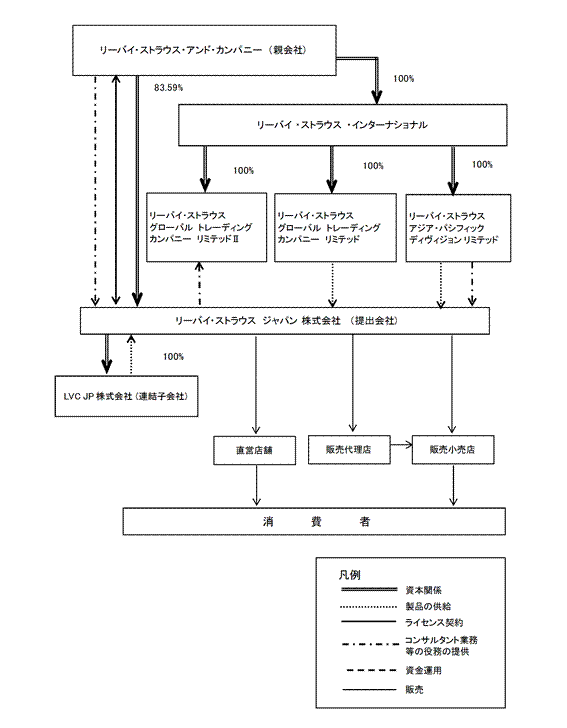 Section titled “3【事業の内容】”当社は、当社株式の83.59%を所有する親会社リーバイ・ストラウス・アンド・カンパニーを中心とするリーバイスグループに属しております。リーバイスグループは世界各地でジーンズ、ジャケット等の製造、販売を行っており、当社は、親会社並びにその親会社の100%子会社のリーバイ・ストラウス・インターナショナルの100%子会社であるリーバイ・ストラウス アジア・パシフィック ディビジョン リミテッド及びリーバイ・ストラウス・グローバル トレーディング カンパニー リミテッドから、それぞれ製品を仕入れ、これらの製品を国内で販売しております。またリーバイ・ストラウス アジア・パシフィック ディビジョン リミテッドはアジア・パシフィック地域におけるリーバイスグループ関連各社の事業活動を統括管理しており、当社は同社からコンサルタント業務等の役務の提供を受けております。平成22年1月にグローバルプレミアム商品の拡販のため、LVC JP株式会社を設立しております。