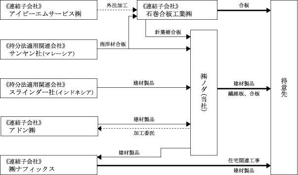 | 住宅建材事業 | 当社が製造するほか、子会社アドン㈱及び関連会社スラインダー社(PT. SURA INDAH WOOD INDUSTRIES)に加工を委託し、当社及び子会社㈱ナフィックスが販売しております。また、子会社㈱ナフィックスは当社の製品を使用した住宅関連工事を請負っております。 |