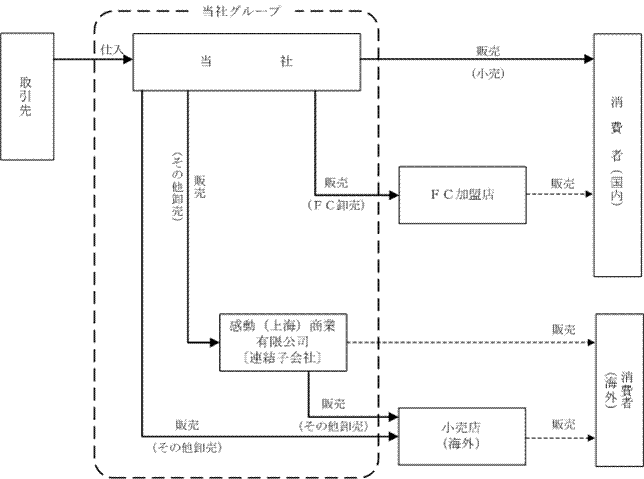 当社は商品の企画、調達を担っており、直営店にて小売販売を営むほか、FC加盟店への卸販売を行っており、海外の小売業者への卸販売を行っております。中国現地法人である感動(上海)商業有限公司(連結子会社)は小売業者への卸販売を手がけております。