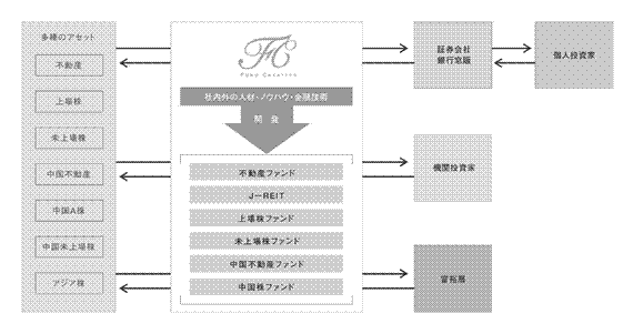 当社グループでは、「投資家のニーズに立脚した魅力的なファンドの開発」を事業コンセプトに、日本の不動産・上場株・未上場株、中国の不動産・A株・未上場株、アジアの新興国株等の新しい投資対象を発掘するのと同時に、個人投資家、富裕層、機関投資家等からの投資ニーズを汲み上げ、それらを当社グループの持つファンドに関するノウハウや金融技術と組み合わせることにより、様々なファンドを投資家に提供しています。