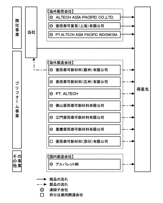 | プリフォーム事業 | ペットボトル用プリフォーム、プラスチックキャップ | 当社 〈連結子会社〉 愛而泰可新材料(蘇州)有限公司 愛而泰可新材料(広州)有限公司 PT.ALTECH 佛山愛而泰可新材料有限公司 江門愛而泰可新材料有限公司 重慶愛而泰可新材料有限公司 〈持分法適用関連会社〉 愛而泰可新材料(深圳)有限公司 |