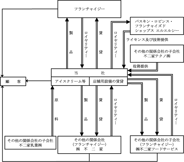 Section titled “3 【事業の内容】”当社は関係会社(その他の関係会社)であるバスキン・ロビンス・フランチャイズド ショップス エルエルシーと「ライセンス及び技術援助契約」を締結しており、日本国内におけるアイスクリーム類の製造・販売並びにフランチャイズ方式によるアイスクリーム販売の組織化及び運営に関するノウハウの提供を受けております。それに対し、当社は売上高の一定率をロイヤリティーとして同社に支払っております。
