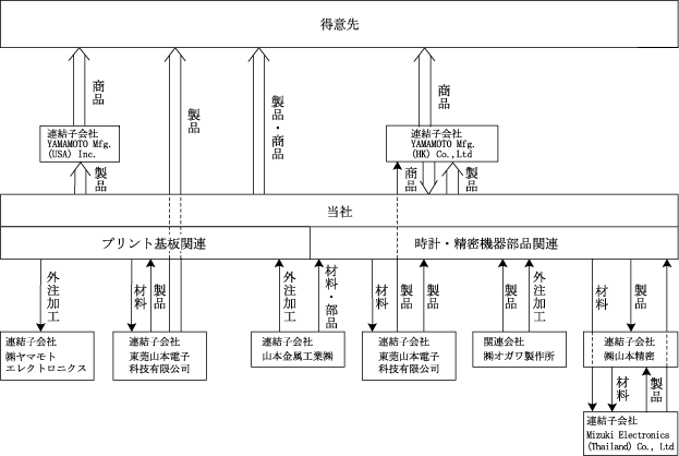 | 時計・精密機器部品関連… | 当社は、時計部品を製造販売しており、子会社YAMAMOTO Mfg.(HK) Co., Ltd.は当社から仕入れて販売しております。 子会社東莞山本電子科技有限公司は、時計部品を製造販売しており、一部は当社及び子会社YAMAMOTO Mfg.(HK) Co., Ltd.で仕入れて販売しております。 時計関連の材料及び一部の部品については、子会社山本金属工業㈱から仕入れているほか、作業工程の一部については関連会社㈱オガワ製作所に下請けさせております。 |