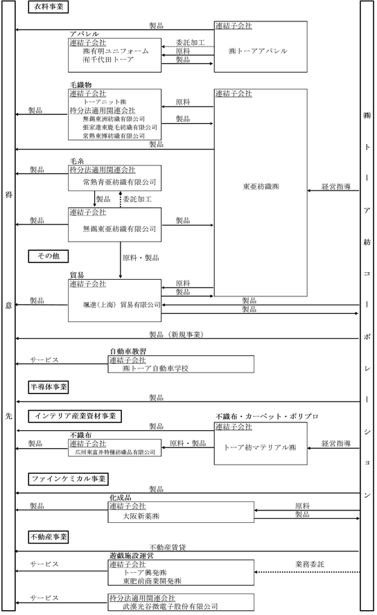 Section titled “3【事業の内容】”当社グループは当社及び東亜紡織株式会社並びに東亜紡織株式会社の子会社3社及び関連会社4社、トーア紡マテリアル株式会社並びにトーア紡マテリアル株式会社の子会社1社、株式会社トーアアパレル並びに株式会社トーアアパレルの子会社2社、その他当社の子会社4社及び関連会社1社により構成されております。