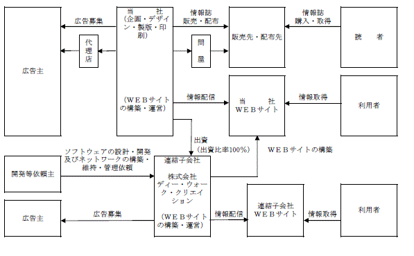 合併前の当社(形式上の存続会社)は、情報サービス業を営んでおりましたが、平成7年4月より休眠中であり、その事業規模は旧株式会社ケージー情報出版に比べて小さく、合併後も企業の実態は旧株式会社ケージー情報出版がそのまま存続しているのと同様であります。また、旧株式会社エスペラントは、旧株式会社ケージー情報出版の発行する情報誌を印刷する印刷会社でしたが、企業の合理化のため当社の印刷部門として吸収しました。このため、以下の事項につきましては別段の記載のないかぎり、合併期日までは実質上の存続会社である旧株式会社ケージー情報出版について記載しております。
