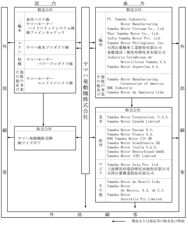 Section titled “3【事業の内容】”当社グループは、当社及び国内外145社の関係会社(子会社117社、関連会社28社(平成25年12月31日現在))によって構成されています。当社グループは、主として、二輪車、船外機、ウォータービークル、ボート、漁船・和船、四輪バギー、レクリエーショナル・オフハイウェイ・ビークル、ゴルフカー、スノーモビル、発電機、汎用エンジン、サーフェスマウンター、自動車用エンジンの製造及び販売を行っています。